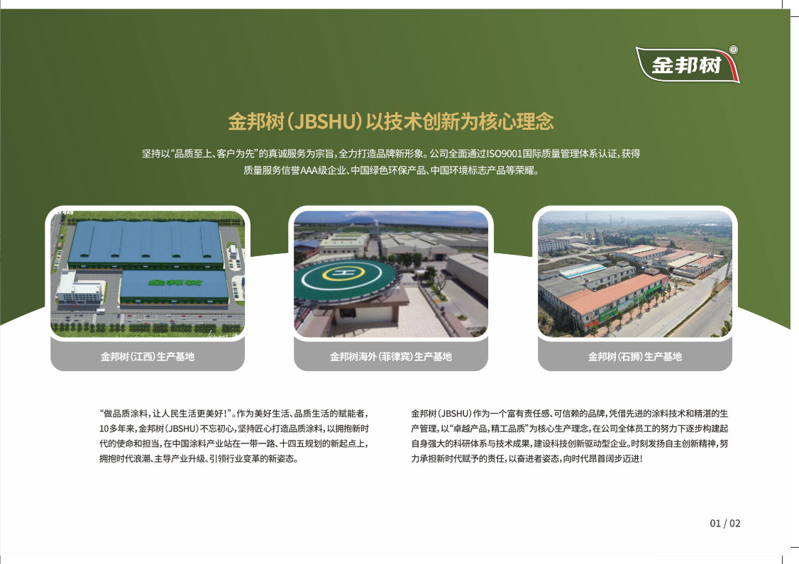 創(chuàng)立于2012年的金邦樹(shù)(JBSHU)(福建)涂料公司是金邦樹(shù)(國(guó)際)化工集團(tuán)在中國(guó)大陸區(qū)城分設(shè)的一家現(xiàn)代化高科技化工生產(chǎn)型企業(yè),公司致力于科研、開(kāi)發(fā)、生產(chǎn)、銷(xiāo)售各類(lèi)高端民用涂料和建筑涂料。因戰(zhàn)路發(fā)展需要,總部先后投入巨資在中國(guó)著名價(jià)鄉(xiāng)石獅市和江西建設(shè)了大型生產(chǎn)基地...【更多