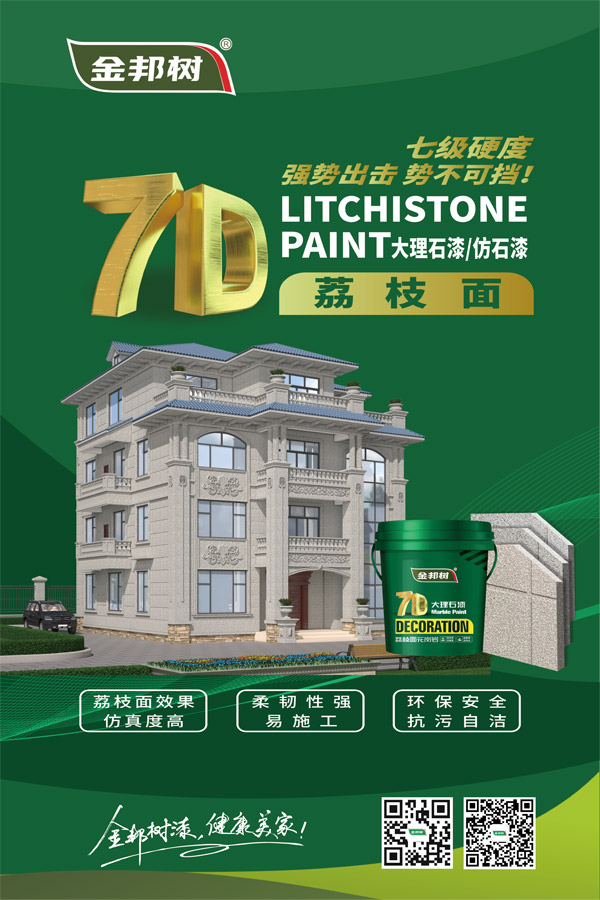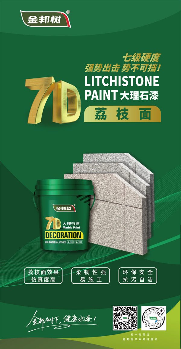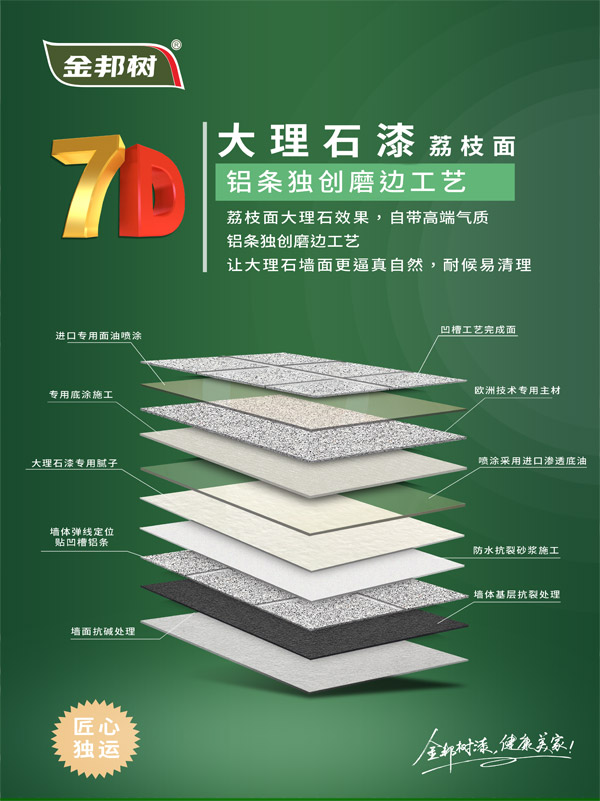 7D大理石漆 金邦樹7D大理石漆采用不同粒徑和形狀的天然碎石、石粉為主要材料展現(xiàn)石材豐富色彩,以耐候性合成樹脂乳液為主要粘結(jié)劑,是一種石材質(zhì)感強(qiáng)烈的墻面裝飾水性環(huán)保建筑涂料。具有花崗石、大理石、天然巖石等石材的溫真裝飾效果,自然的色彩、堅(jiān)硬如石的飾面,盡呈莊熏、典雅與高費(fèi)的風(fēng)范。 Really stone paint 金邦樹7D荔枝面宣傳視頻 7D大理石漆施工工藝流程