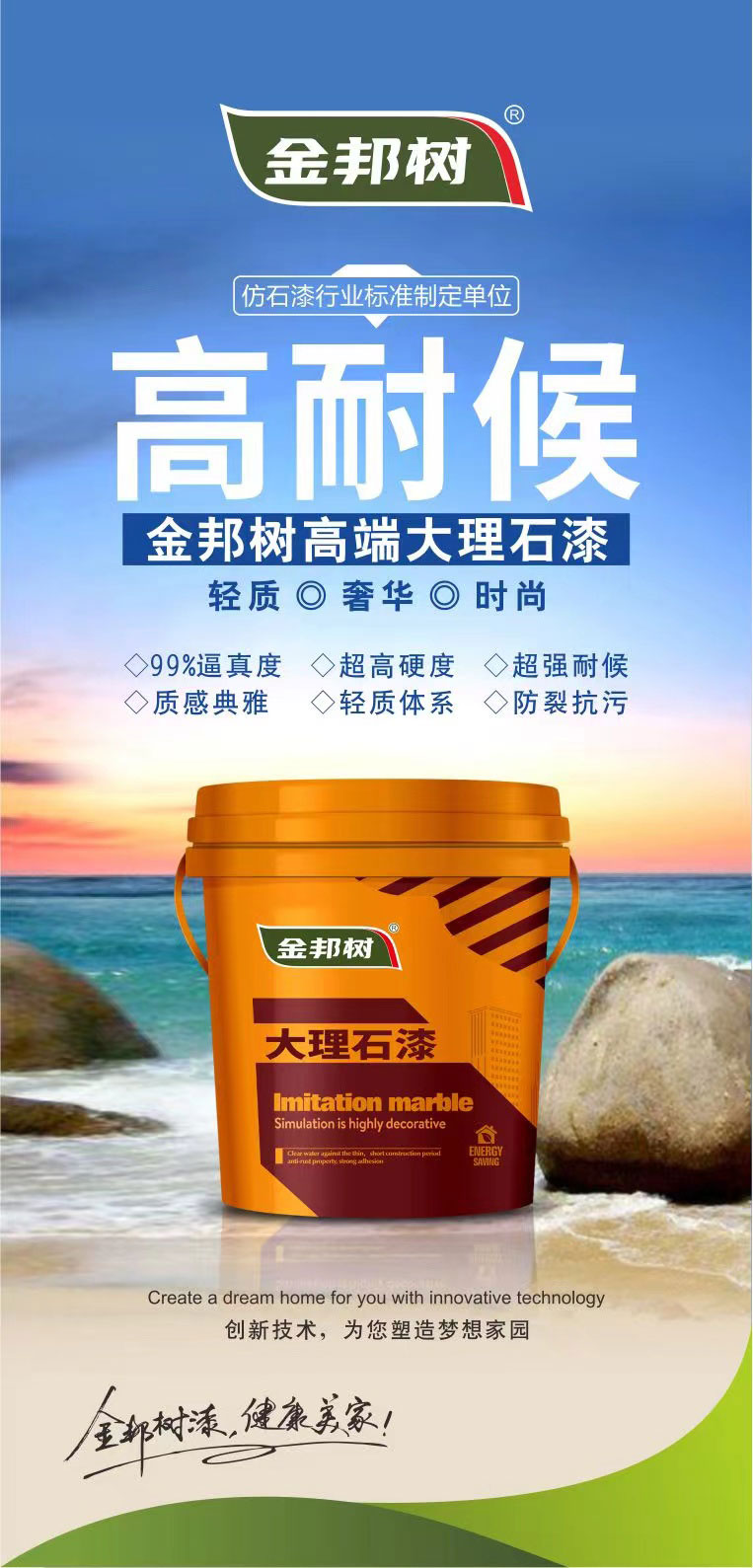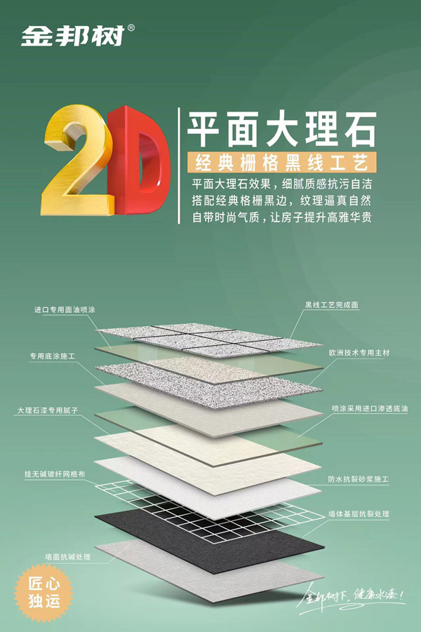 2D大理石漆 金邦樹2D大理石漆采用進(jìn)口彩色顆粒包裹成粒技術(shù),材料中同時(shí)融入不相溶的多色彩的高分子膠體共聚物顆粒,形成不規(guī)則花紋的仿進(jìn)口大理石紋路喝色彩,通過一次性噴涂,就可創(chuàng)造出幾乎和原石一樣的紋理效果,本產(chǎn)品漆乳液含量更高,高硬度、抗污性,超強(qiáng)超候性,能與真石材媲美。 Really stone paint 金邦樹平面2D大理石漆宣傳視頻 平面2D仿大理石漆施工工藝詳解